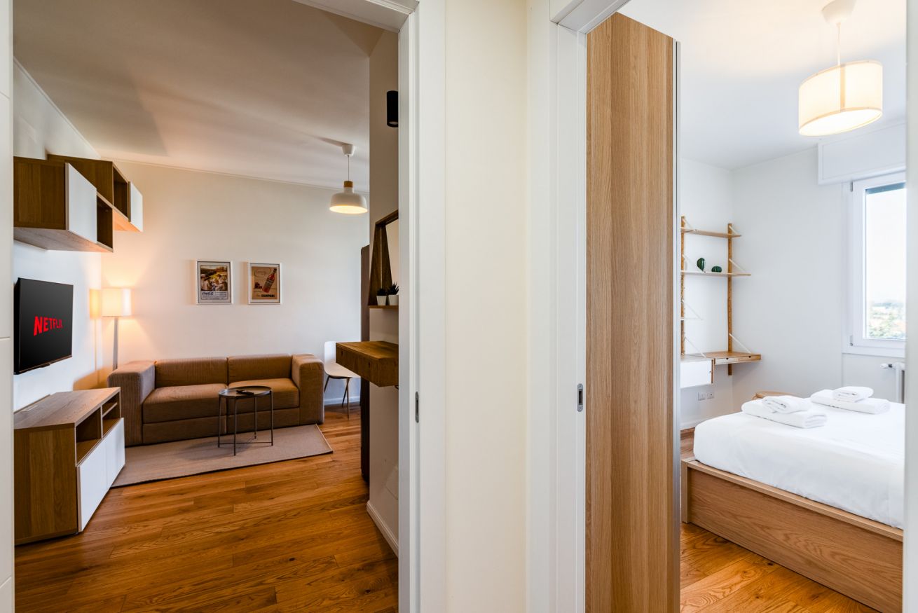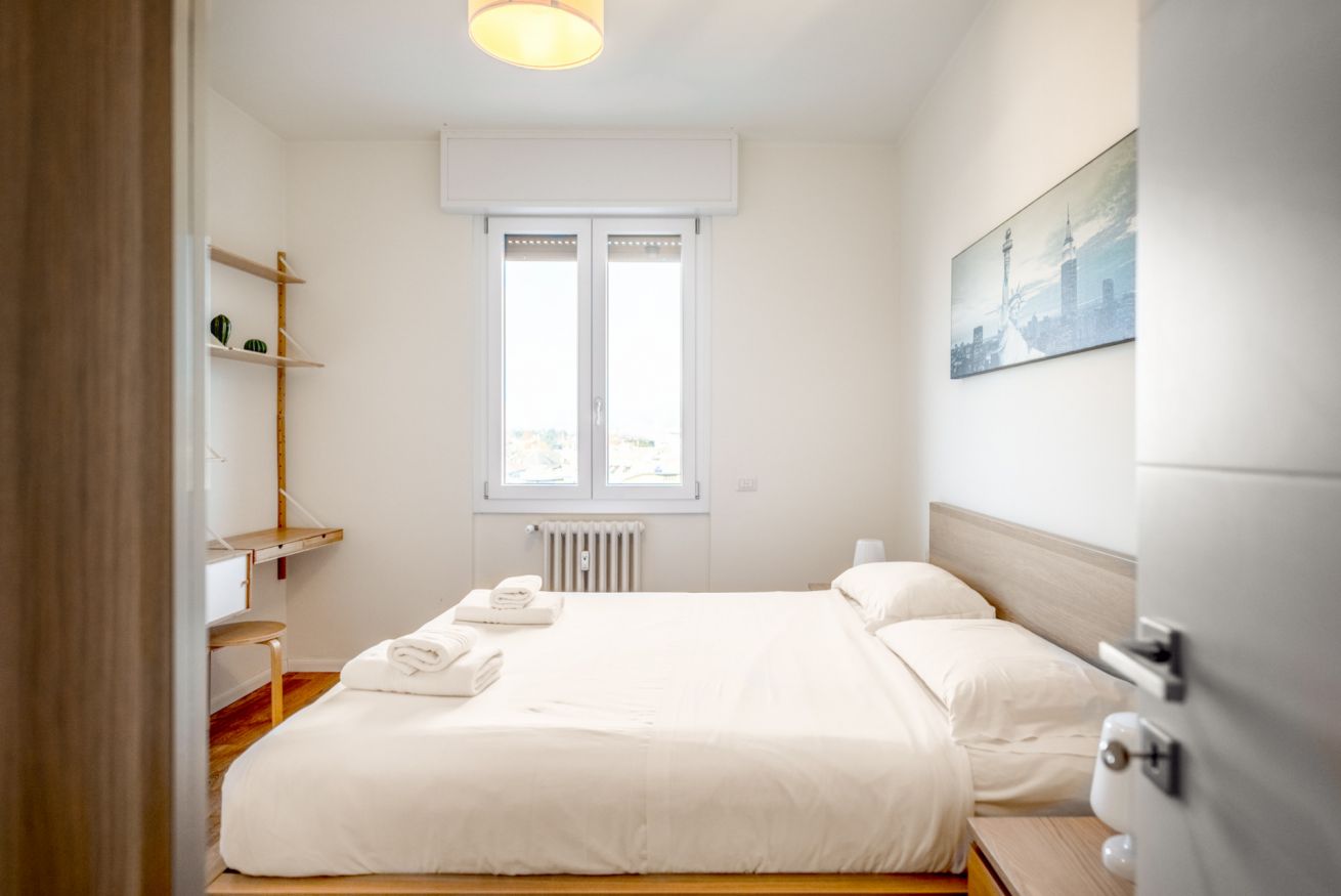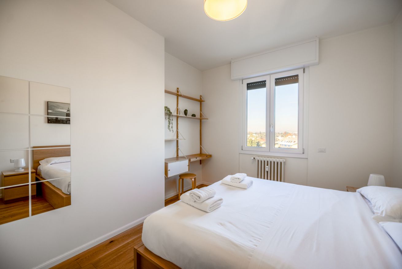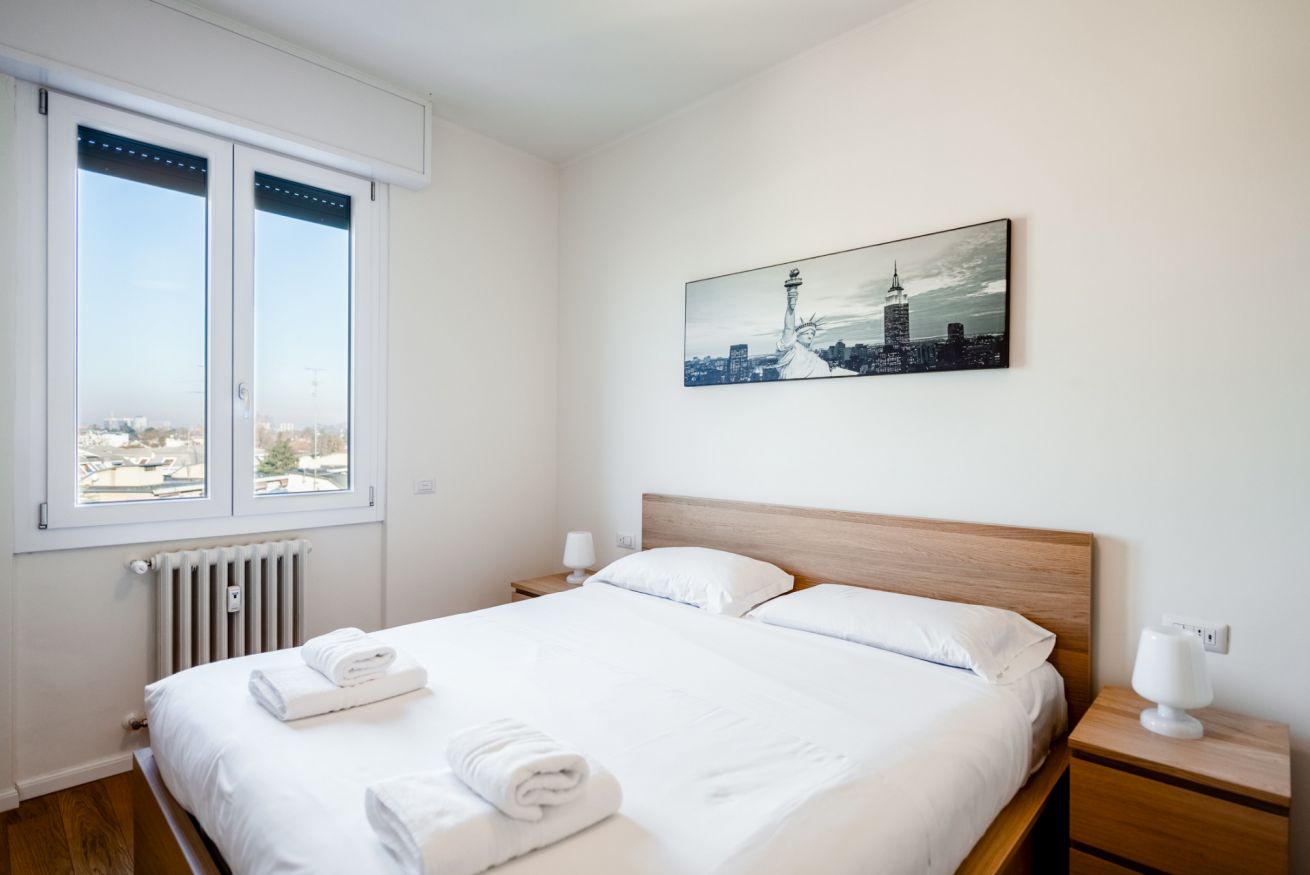 Hai mai desiderato svegliarti con la luce che filtra attraverso una finestra ad un piano alto mentre la città si prepara al giorno? Questo bilocale offre proprio questo: un rifugio luminoso e silenzioso, ideale per coppie o viaggiatori solitari. La camera da letto, accogliente e ben arredata, promette notti di riposo profondo. Il soggiorno, con angolo cottura a vista, è il luogo perfetto per iniziare la giornata con una colazione preparata con cura. Una piccola terrazza ad L offre uno scorcio sulla città e San Siro, invitando a una pausa all'aria aperta. Con aria condizionata, Wi-Fi e una posizione strategica – a pochi passi dalla metro M5 Segesta e a breve distanza dallo Stadio San Siro – questo appartamento è il punto di partenza ideale per esplorare Milano.